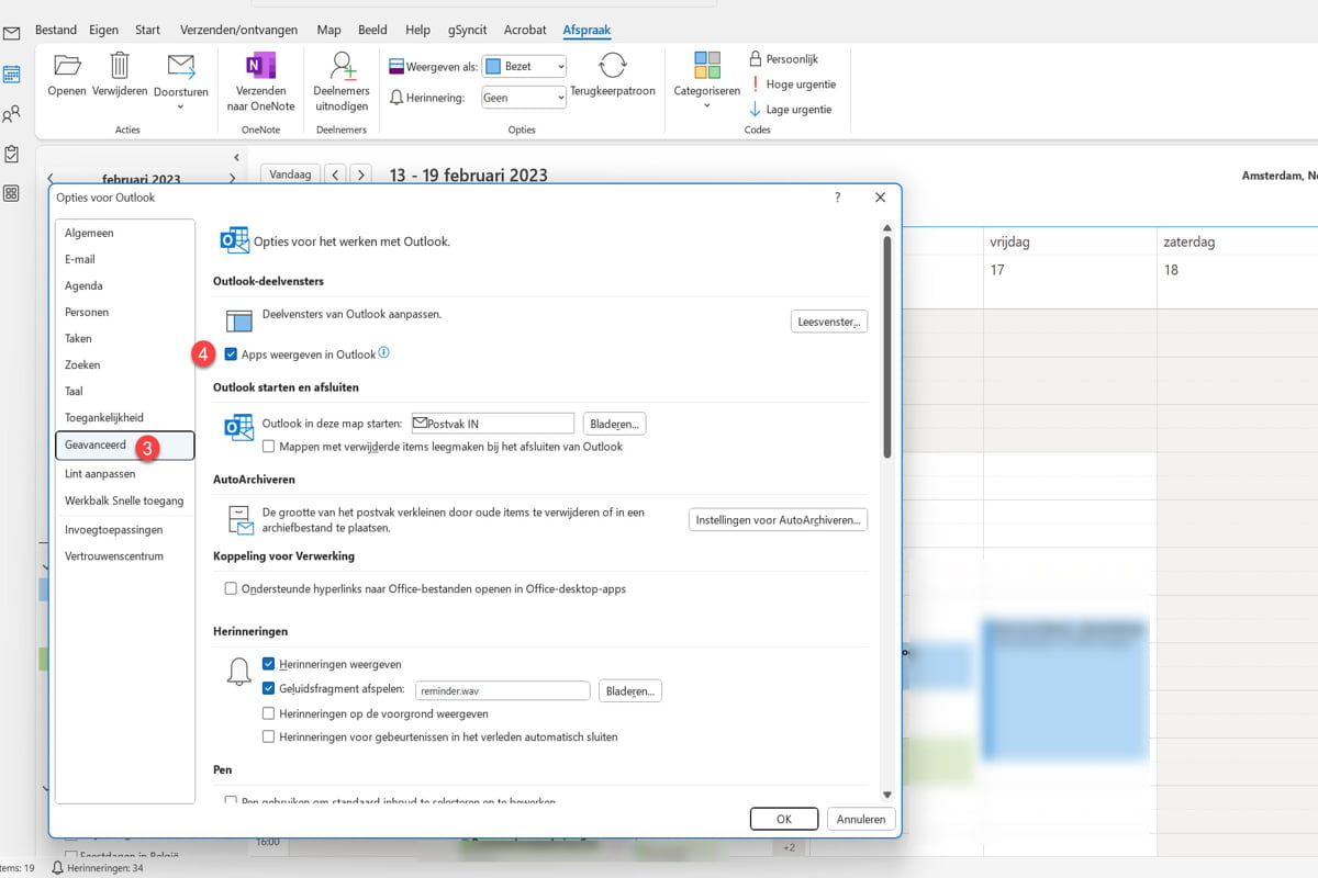 Rechts zie je nu bij “Outlook deelvensters” een vinkje staan bij “Apps weergeven in Outlook”.