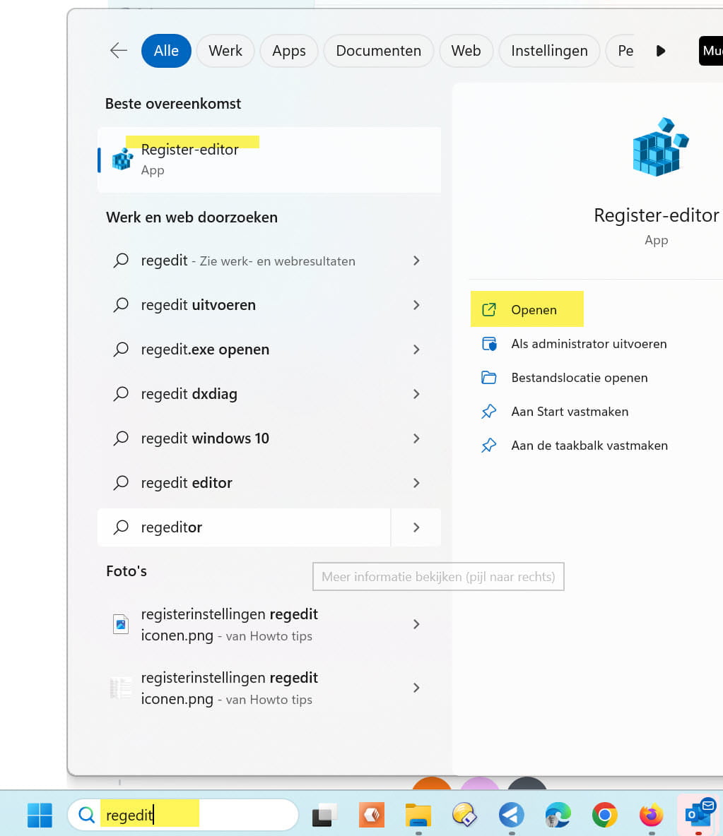 Typ in de commandobalk of de zoekbalk regedit in. Open de registereditor.